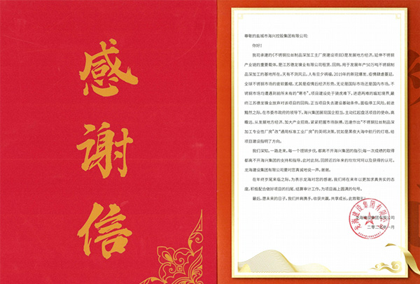 灌東投資公司拉絲廠房項(xiàng)目組收到來自承建單位龍海建設(shè)集團(tuán)的感謝信。2025-02-09 -