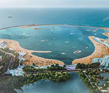 該項目位于月亮灣旅游度假區(qū)海堤外側(cè),以海濱文體旅游綜合體為定位,以2012年四條鯨魚擱淺新灘鹽場附近事件為引,結(jié)合古黃河文化和海洋文化,構(gòu)建以“鯨魚沙灘”為主題的IP。